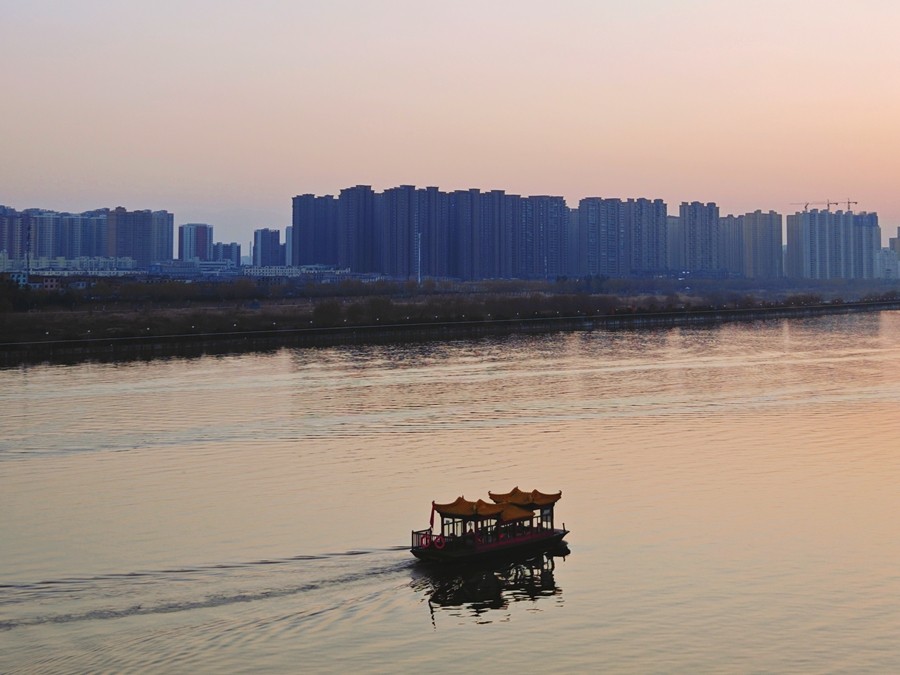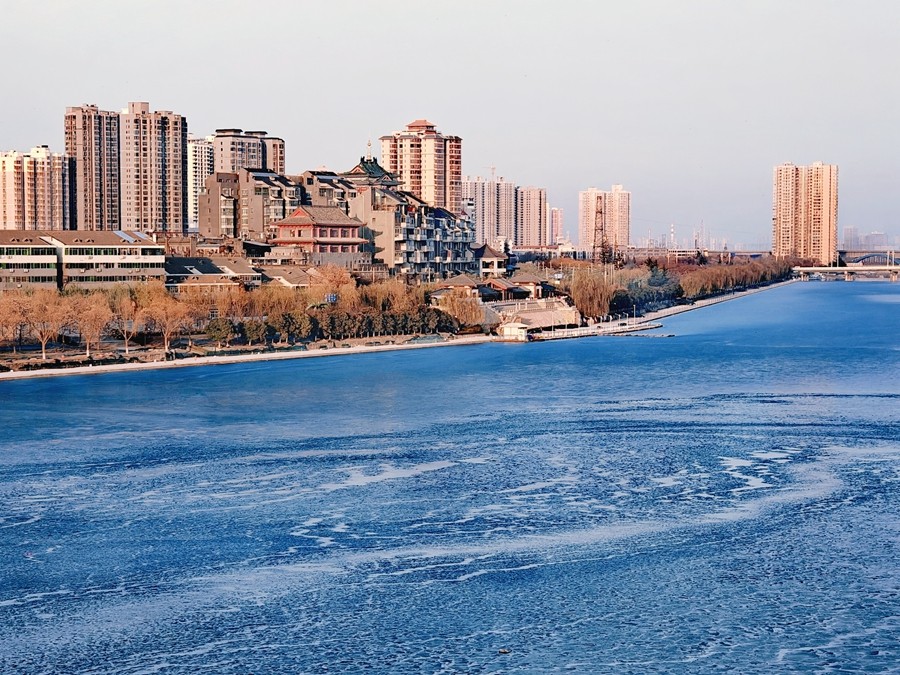 当微风吹过,冰面就会发出响亮的声响,似乎在诉说着冬天的故事。远处的高楼、冰面、桥尚有那划破清静水面的游船,形成了一幅漂亮的冬日画卷。(胡家河矿 张宝龙)