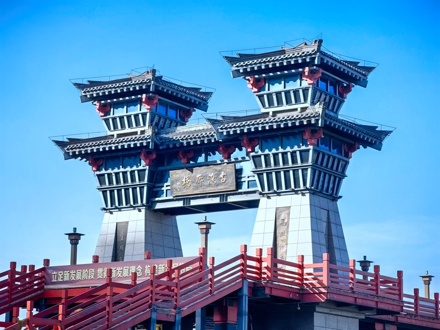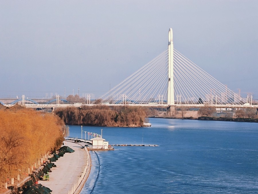 封冰岸树还争绿,冻水湖光尽放蓝。闲步于古渡廊桥之上,感受这咸阳湖冬季的别样韵味。当午后的阳光洒在冰面上时,那道道冰裂纹显得格外晶莹剔透,犹如一颗重大的宝石。